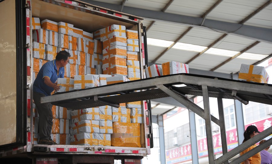 A staff member of delivery service loads a truck with goods at Haitou Town in Lianyungang, east China's Jiangsu Province, June 5, 2020. (Xinhua/Li Yuze)