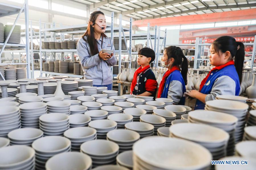 Primary school students learn about porcelain works at a workshop of Ru porcelain in Baofeng County, central China's Henan Province, on Nov. 15, 2020.