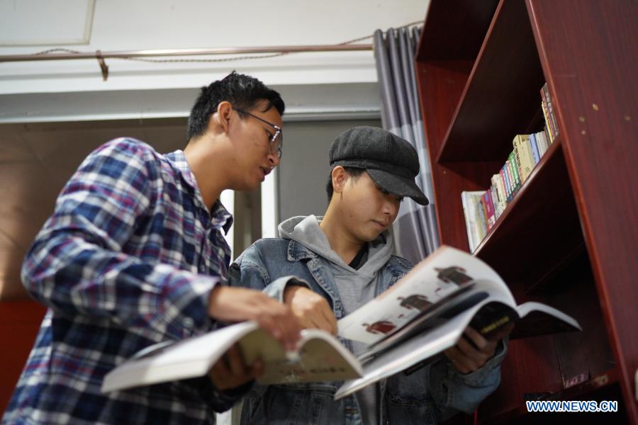 "Qianzhou Armament Department" members Zeng Fanqiang (L) and Xiao Qiu read books on ancient armours at their studio in Ganzhou, east China's Jiangxi Province, Nov. 13, 2020. Members of "Qianzhou Armament Department" share a common goal: to replicate ancient Chinese armours with their own hands. In 2018, the hobbyist group was founded by a bunch of local armament fans, and was named after its city of origin, Ganzhou, which was known historically as Qianzhou.