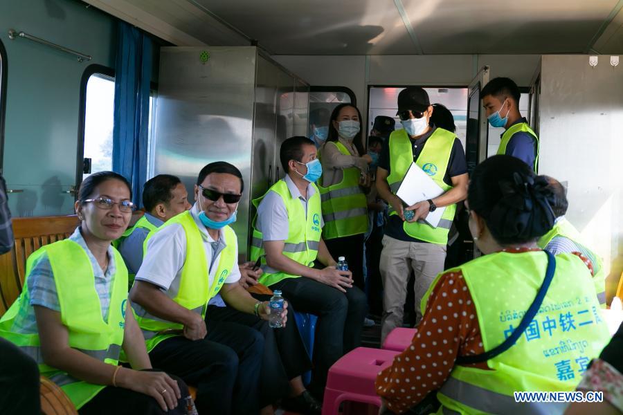A group of members of the National Assembly (NA) of Laos take an engineering train in Vientiane, capital of Laos, Nov. 14, 2020. A Lao National Assembly (NA) visit group, consisting of 55 NA members, visited a rail-welding yard of the China Railway No. 2 Engineering Group (CREC-2) on Saturday. (Photo by Kaikeo Saiyasane/Xinhua)
