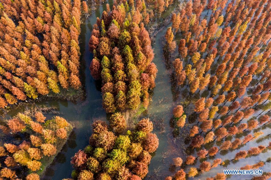 Aerial photo taken on Nov. 15, 2020 shows a dawn redwood forest at Hongze Lake Wetland Scenic Area in Sihong County, Suqian, east China's Jiangsu Province. (Photo by Xu Changliang/Xinhua)