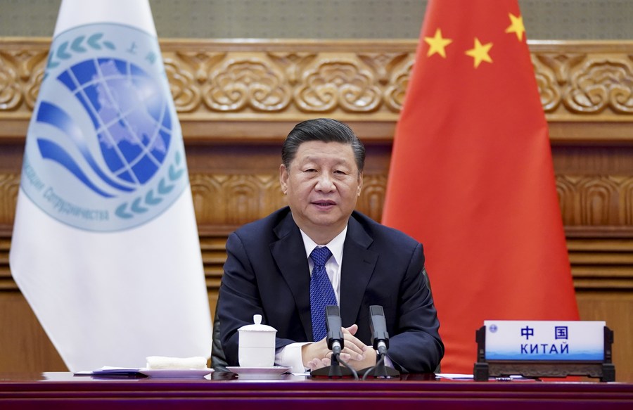 Chinese President Xi Jinping attends the 20th meeting of the Council of Heads of State of the Shanghai Cooperation Organization (SCO) via video link in Beijing, capital of China, on Nov. 10, 2020. (Xinhua/Li Xueren)