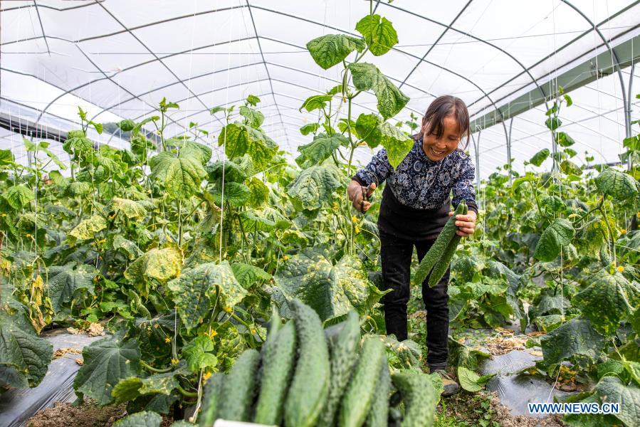 A villager collects cucumbers in a green house in the agricultural base at Dongping Village in Xindian Town of Yuping Dong Autonomous County, southwest China's Guizhou Province, Nov. 15, 2020. In recent years, farmers in Yuping Dong Autonomous County developed a mode in developing local agriculture that involves the participation of enterprises, cooperatives, model bases and farmers as a way to help locals increase their incomes. (Photo by Fan Hui/Xinhua)
