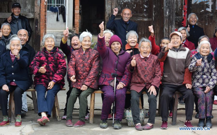 Villagers pose for a group photo in Shangwei Village of Youlan Town, Nanchang City, east China's Jiangxi Province, Nov. 22, 2020. Since 2014, volunteers from a non-profit organization in Nanchang City have kept on taking photos of smiling faces of farmers aged over 70 years old in nearby villages. The portait photos taken by volunteers were given to farmers for free. By far, the volunteers have taken nearly 4,350 people and 50,000 photos. They aim at collecting high-definition images of 10,000 farmers within 10 years. (Xinhua/Chen Chunyuan)