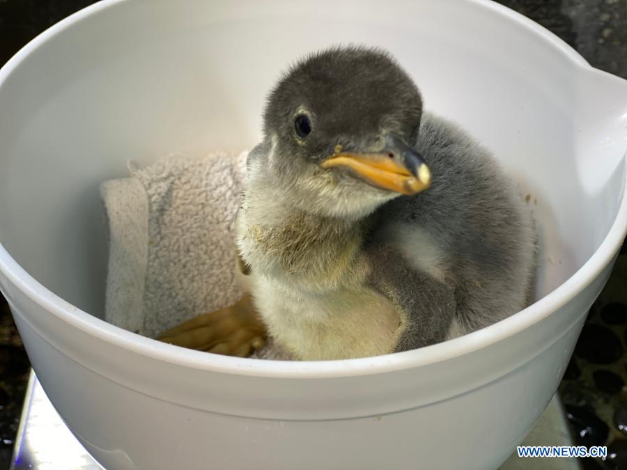 A penguin chick prepares for weighing at Sydney's Sea Life Aquarium in Sydney, Australia, Nov. 6, 2020. The Aquarium announced the birth of a brood of Gentoo penguins on Sunday, with the oldest entering the world in mid-October, while the youngest hatched just two weeks ago. (Xinhua)