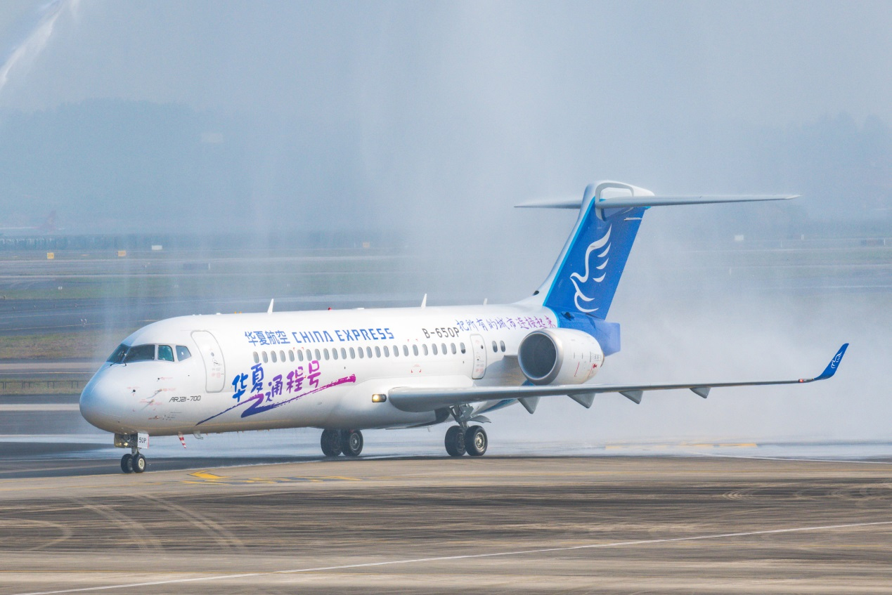 The first ARJ21 aircraft delivered by the Commercial Aircraft Corporation of China, Ltd. to China Express Airlines gets a water cannon salute at the Chongqing Jiangbei International Airport, southwest China's Chongqing municipality, Nov. 10. (Photo by Zou Le/People's Daily Online)