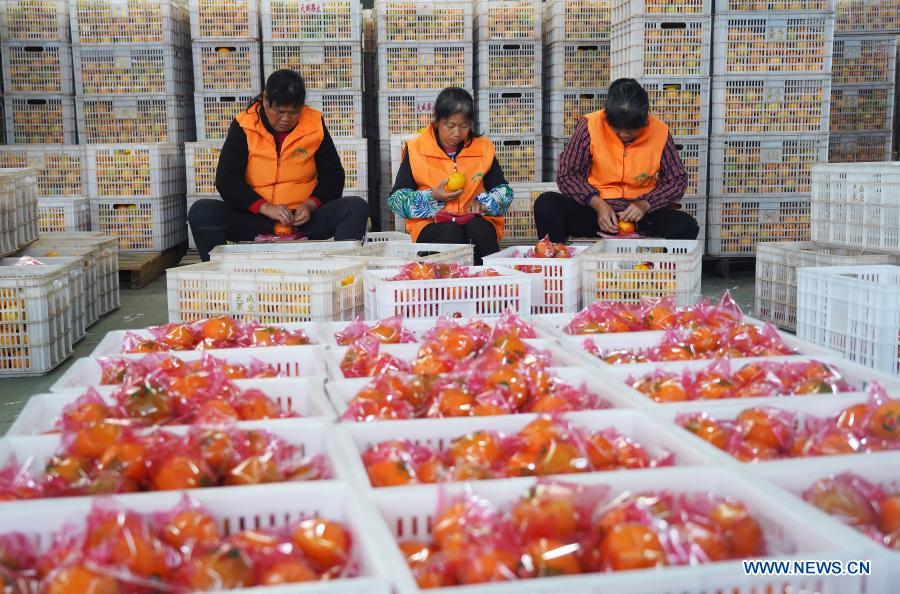 Farmers pack navel oranges for delivery in Yeping Township of Ruijin City, east China's Jiangxi Province, Nov 24, 2020. (Xinhua/Wan Xiang)