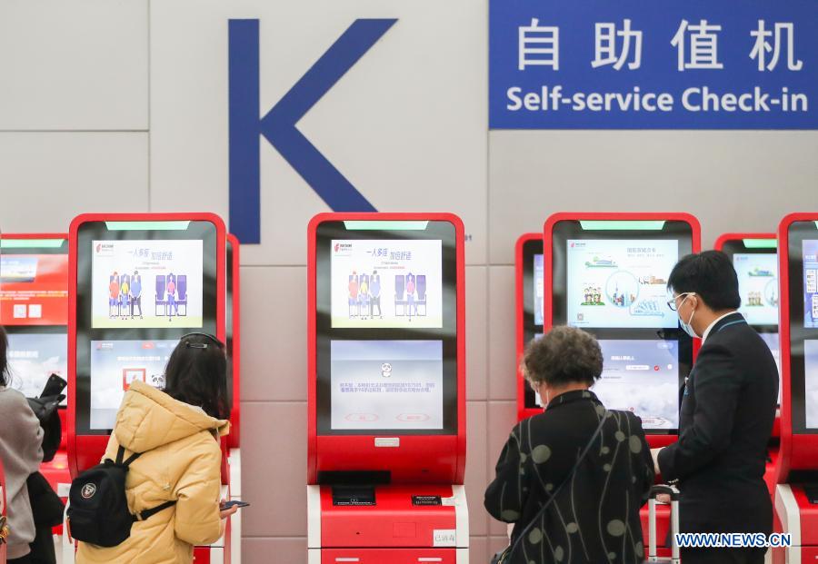 Passengers perform self-service check-in process at Terminal 2 building of the Shanghai Pudong International Airport in east China's Shanghai, Nov. 24, 2020. The airport's recent daily throughput maintains at around 1,000 flights, with passengers wearing face masks and orderly moving in and out. (Xinhua/Ding Ting)