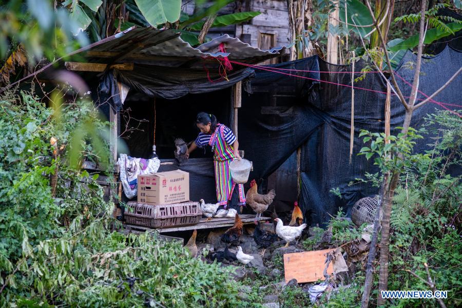 Dulong villager Li Yuanmei feeds chickens in Dizhengdang Village of Dulongjiang Township, Gongshan Dulong and Nu Autonomous County, southwest China's Yunnan Province, Oct. 29, 2020. Dulong is a mountain-dwelling ethnic group in southwest China. It is one of the least populous of China's 56 minority nationalities. It is also called a "direct-transition" minority ethnic group because the Dulong people didn't bid farewell to primitive life until the founding of the People's Republic of China in 1949 and since then they directly stepped into the socialist society. Most Dulong people live in Dulongjiang Township, where an inhospitable mountainous terrain had been thwarting the town's development for decades. Thus, the township had been one of the poorest area in Yunnan Province and even in the entire country. But the local economic and social development has been fast-tracked in recent years when many difficulties that bottlenecked the development were eliminated thanks to state and provincial efforts. For example, the town built better infrastructure, developed specialized industries and enrolled high-quality talents. In 2018, the Dulong ethnic group shook off poverty as a whole, a phenomenal breakthrough. Nowadays, all of the 1,100-plus households in Dulongjiang have moved into new, better residences. Many residents are now engaged in herbal planting and poultry husbandry with local characteristics. All of the six administrative villages have access to roads with hard surfaces and signals of radio and TV, and are all covered by the 4G network. All villagers benefit from a critical illness insurance program. Meanwhile, the youngsters are entitled to 14 years of free education which lasts from pre-school classes to high school education. The rate of primary school attendance and that of enrollment into schools for higher levels have both remained 100 percent. Nowadays, Dulongjiang is no longer the isolated, conservative and backward region it used to be. The Dulong people here are embracing modern life at a faster pace and are keeping pace with the outside world. (Xinhua/Hu Chao)