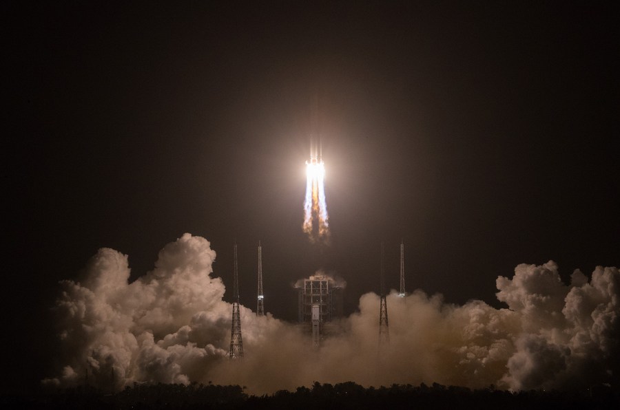 A Long March-5 rocket, carrying the Chang'e-5 spacecraft, blasts off from the Wenchang Spacecraft Launch Site on the coast of southern island province of Hainan, Nov. 24, 2020. (Xinhua/Jin Liwang)