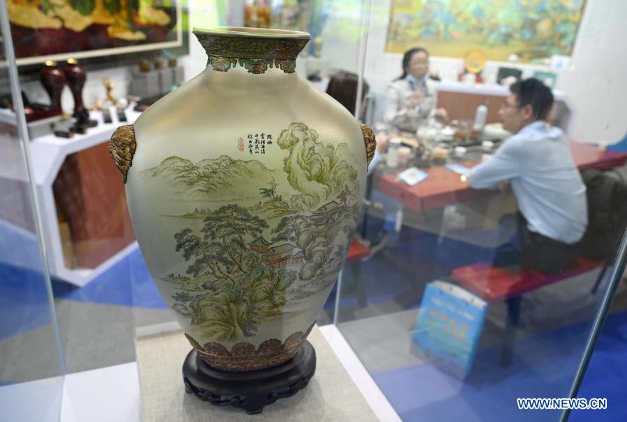 A lacquer vase is displayed during the 6th Maritime Silk Road (Fuzhou) International Tourism Festival in Fuzhou, southeast China's Fujian Province, Nov. 27, 2020. The 6th Maritime Silk Road (Fuzhou) International Tourism Festival kicked off in Fuzhou on Friday. (Xinhua/Lin Shanchuan)