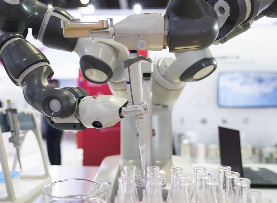 Photo taken on Nov. 9, 2020 shows YuMi collaborative robot at the booth of tech giant ABB at the Intelligent Industry and Information Technology exhibition area during the third China International Import Expo (CIIE) in Shanghai, east China. (Xinhua/Zhang Haofu)