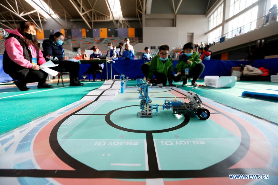 Contestants participate in a robotics competition for middle and primary school students in Jimo District of Qingdao, east China's Shandong Province, Nov. 29, 2020. The robotics competition has 20 categories, attracting more than 300 middle and primary student contestants from across Jimo District. (Photo by Liang Xiaopeng/Xinhua)