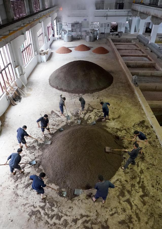 Workers mix grains with yeast at a distillery in Maotai town of Renhuai, southwest China's Guizhou Province, Nov. 28, 2020. Maotai is a small town in Renhuai City in mountainous Guizhou. What distinguishes it from other towns is that it produces a famous brand of Chinese liquor Moutai. The spirit, made from sorghum and wheat, takes up to one year for the whole production process, involving nine times of steaming, eight times of fermentation and seven times of distillation, before aged in clay pots. (Xinhua/Wang Yuguo)