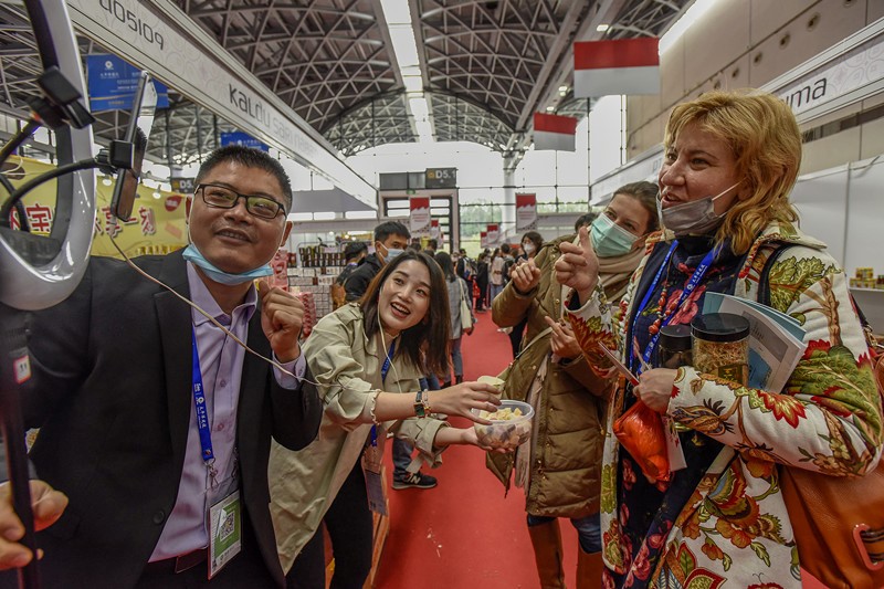A Malaysian livestreams its exhibition during the 17th China-ASEAN Expo in Nanning, south China’s Guangxi Zhuang Autonomous Region, Nov. 28. (Photo by Peng Huan/People's Daily Online)
