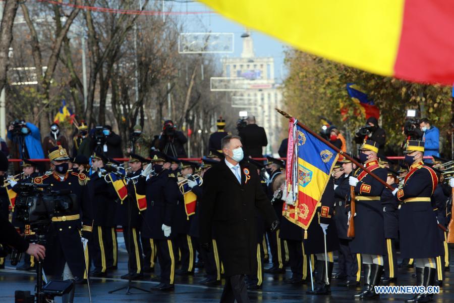 Romanian President Klaus Iohannis attends Romania's National Day celebration in Bucharest, Romania, Dec. 1, 2020. Romania held a simplified National Day celebration ceremony this year amid severe pandemic, without the large-scale military parade and flight performances of previous years. (Photo by Gabriel Petrescu/Xinhua)