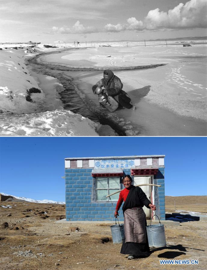 In this combo photo, the upper part shows a resident collecting water from a river in Namco Township of southwest China's Tibet Autonomous Region; the lower part shows a resident carrying drinking water home from a well built under the safe drinking water project in Nyainrong County of Nagqu City, southwest China's Tibet Autonomous Region, Nov. 9, 2011. From 2016 to 2020, Tibet Autonomous Region invested 4.3 billion yuan (about 657 million U.S. dollars) in drinking water projects, improving 17,581 rural water projects. Now, clean drinking water has become a reality for around two million residents. (Xinhua)