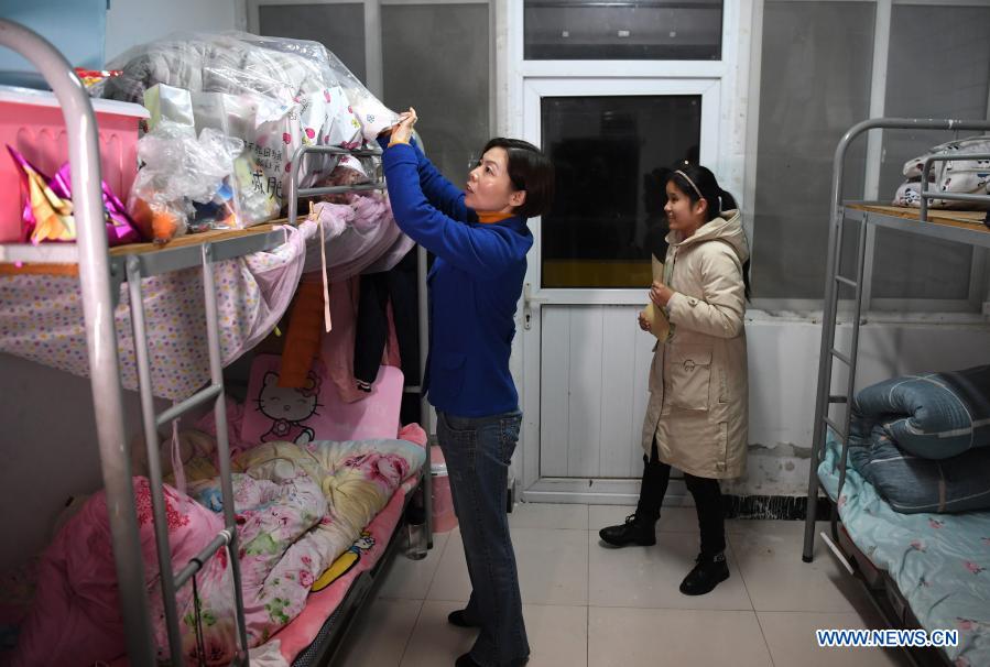 Xi Weijing, head of the Wuhu School for the Blind, helps a student to tidy up belongings while inspecting dormitories at the school in Wuhu City, east China's Anhui Province, Nov. 25, 2020. Xi Weijing's parents are both visually-impaired. Her father Xi Manqiao set up a private school for the blind in 1979, devoting all his energy to the work of the school. After her father died of illness in 1994, Xi Weijing, then in her 20s, took the burden and became the second principal of the Wuhu School for the Blind. With the support of local government, the Wuhu School for the Blind has been relocated several times and its operating conditions have been greatly improved. At present, the school has more than 30 full-time teachers and more than 200 students. With a belief that special education is not only about imparting knowledge, but more importantly, shaping souls, Xi Weijing and her colleagues insisted on being students' friends. She set up several bands for the students, improved the vocational education on massage therapy, and encouraged students to take the college entrance exam for the blind. "I will devote my whole life to the school, bringing a wider world to them." Xi Weijing said. (Xinhua/Liu Junxi)