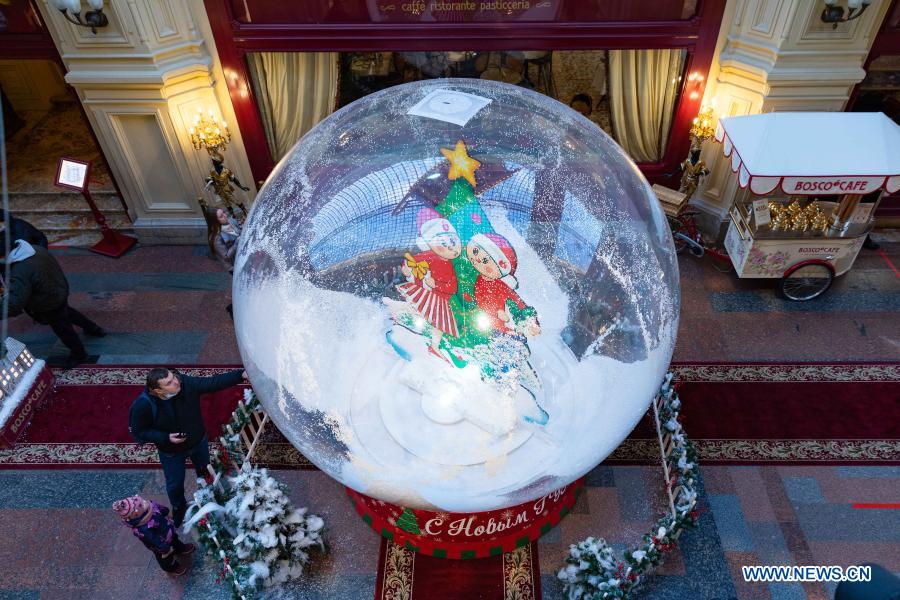 New Year decorations are seen in the GUM department store near Red Square in Moscow, Russia, on Dec. 2, 2020. (Xinhua/Bai Xueqi)