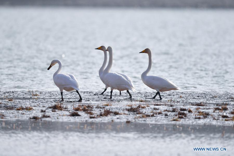 Swans are seen at the bank of the Yellow River in Hualong Hui Autonomous County of Haidong City, northwest China's Qinghai Province, Dec. 2, 2020. (Xinhua/Zhang Long)