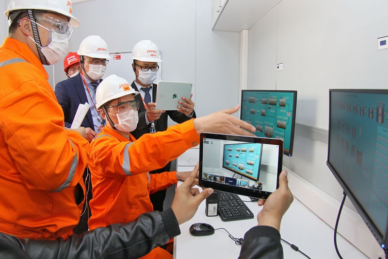 Photo taken on Mar. 30 shows technicians demonstrate their equipment in details and its function-testing process to Saudi customers via a live broadcast at Jereh, a global group specializing in oil & gas, power and environmental management in Yantai, east China's Shandong province. (Photo by Tang Ke/People's Daily Online)