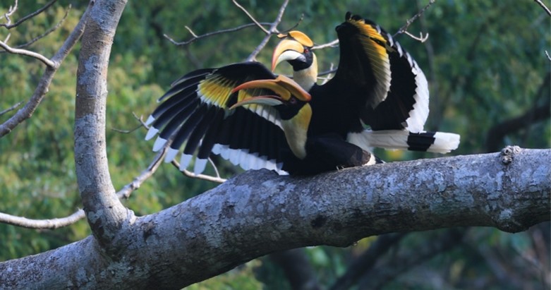 Great hornbill rest on a tree in Tongbiguan provincial nature reserve in southwest China's Yunnan province. (Photo courtesy of the Forestry and Grassland Administration of Yunnan province.)
