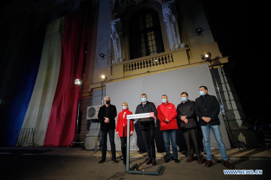 Romania's Social Democratic Party (PSD) leader Marcel Ciolacu (3rd L) is seen at the PSD headquarters in Bucharest, Romania, on Dec. 6, 2020. Romania's main opposition Social Democratic Party (PSD) is likely to win the most votes in the country's quadrennial parliamentary election on Sunday, according to a surprising exit poll jointly launched by poll agencies CURS and Avangarde as voting ended at 9:00 p.m. local time (1900 GMT). (Photo by Cristian Cristel/Xinhua)