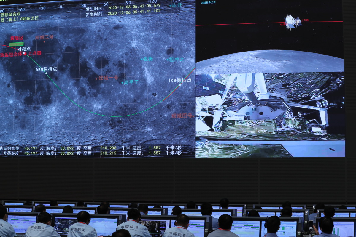Technicians at the Beijing Aerospace Control Center monitor the docking of the Chang'e 5 lunar probe's ascender with its orbiter-reentry capsule combination on Sunday. JIN LIWANG/XINHUA