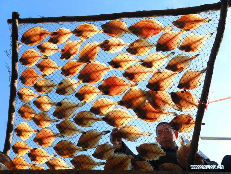 A fisherman dries fish in Duoshi Village of Jimo District in Qingdao, east China's Shandong Province, Dec. 6, 2020. (Photo by Liang Xiaopeng/Xinhua)