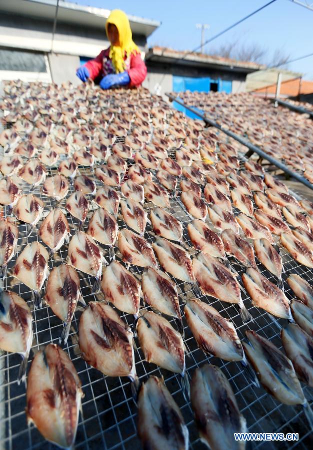 Fishermen dry fish in Duoshi Village of Qingdao, E China