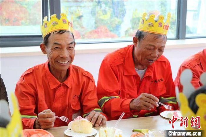 Photo shows sanitation workers celebrating a birthday at a rest station. (Photo/Chinanews.com)