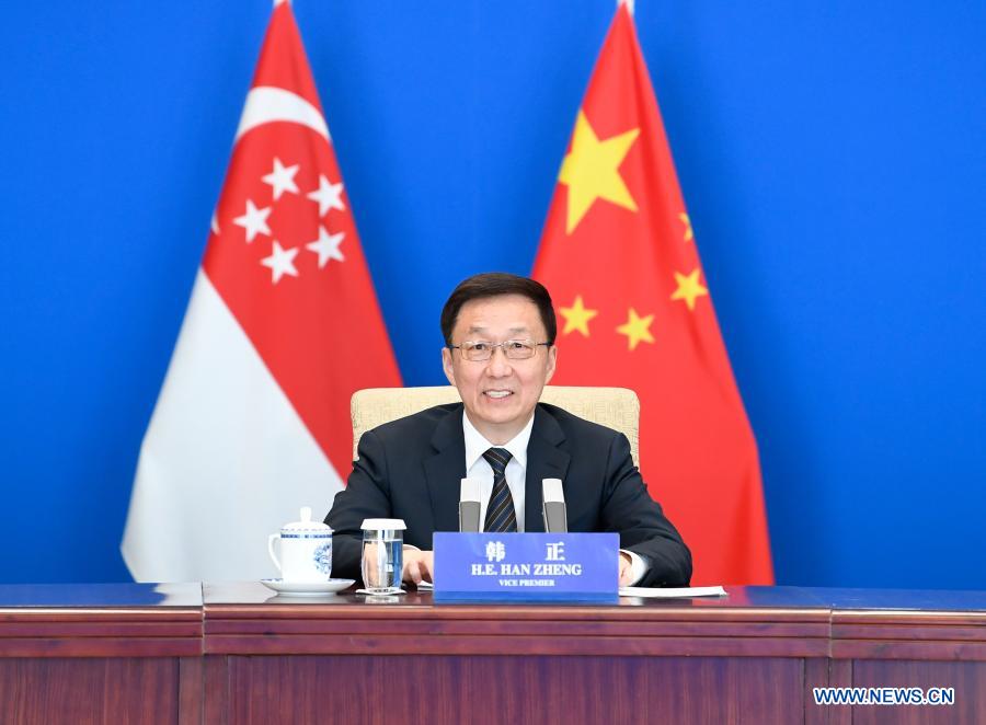 BEIJING, Dec. 8 (Xinhua) -- Chinese Vice Premier Han Zheng Tuesday met with Singaporean Deputy Prime Minister Heng Swee Keat via video link and they co-hosted four meetings of bilateral cooperation mechanisms.