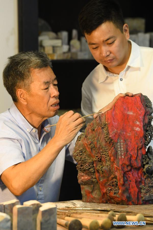 Qian Gaochao (L), national level master of arts and crafts, carves on a Jixue stone as his son Qian Youjie looks on at his studio in Lin'an District of Hangzhou City, east China's Zhejiang Province, Nov. 5, 2020. The Jixue stone, featuring chicken-blood bright red traces, a local specialty in Changhua Town of Hangzhou City, is a highly sought-after material for making seals and carving handicrafts. Inspired by its colors, artisan have been bringing ingeniously-designed and broadly-themed creations throughout its long history and helped form the Jixue stone carving's unique features with their relentless pursuit of craftsmanship. The Changhua Jixue stone carving was listed in the second batch of the national intangible cultural heritage list in 2008. The vitality of this heritage has never faded away with time. In recent years, the local government has adopted a series of measures to facilitate the industrial development and the cultivation of young artisans. The Changhua Jixue stone carving is blossoming with new life in heritage and innovation. (Xinhua/Weng Xinyang)