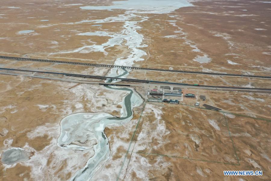Aerial photo taken on Dec. 6, 2020 shows the wildlife rescue center outside the Sonam Dargye Protection Station in Hoh Xil, northwest China's Qinghai Province. At an average altitude of over 4,600 meters, the Hoh Xil is home to various wild animals and reputed as "wildlife paradise". In an effort to strengthen the protection of wild animals, the Sonam Dargye Protection Station founded a wildlife rescue center in 2000. The center has saved, fed and medically treated more than 300 wild animals including Tibetan antelopes and bar-headed goose since its foundation. At present, a total of 13 Tibetan antelopes, two upland buzzards, one black sheep and one Tibetan gazelle are living in the rescue center, waiting to be released into the wild when condition is proper. (Xinhua/Wang Yan)