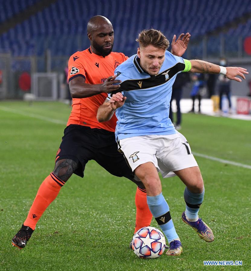 Lazio's Ciro Immobile (R) vies with Club Brugge KV's Eder Balanta during the UEFA Champions League Group F match between Lazio and Club Brugge KV in Rome, Italy, on Dec. 8, 2020. (Photo by Augusto Casasoli/Xinhua)