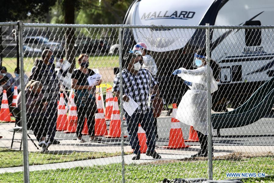 People are seen at a COVID-19 testing center at the San Fernando regional park in Los Angeles County, the United States, Dec. 8, 2020. This is the only walk-in COVID-19 testing center in Los Angeles for those who can not drive or do not own a car. The United States has set new world records for COVID-19 core metrics including hospitalizations, seven-day average case and death increases, as the total number of confirmed cases topped 15 million on Tuesday. California issued a new stay-at-home order which goes into effect within 48 hours in regions with less than 15 percent intensive care availability. Tens of millions of people in the state's southern and San Joaquin Valley regions are now under the new stay-at-home order. (Xinhua)