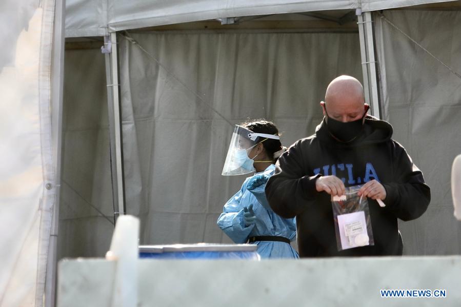 People are seen at a COVID-19 testing center at the San Fernando regional park in Los Angeles County, the United States, Dec. 8, 2020. This is the only walk-in COVID-19 testing center in Los Angeles for those who can not drive or do not own a car. The United States has set new world records for COVID-19 core metrics including hospitalizations, seven-day average case and death increases, as the total number of confirmed cases topped 15 million on Tuesday. California issued a new stay-at-home order which goes into effect within 48 hours in regions with less than 15 percent intensive care availability. Tens of millions of people in the state's southern and San Joaquin Valley regions are now under the new stay-at-home order. (Xinhua)