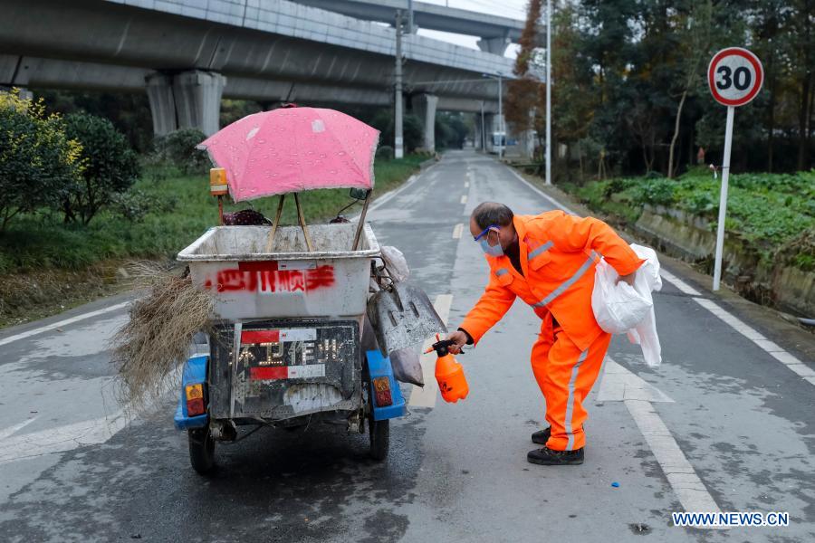 A worker sanitizes a garbage cart in Taiping Village of Pidu District in Chengdu, southwest China's Sichuan Province, Dec. 9, 2020. (Xinhua/Shen Bohan)