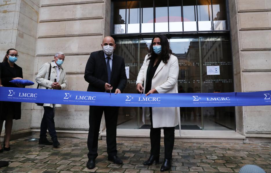 Merouane Debbah (2nd R), director of the R&D Center of Huawei France, attends a ribbon-cutting ceremony of Huawei's sixth research center in France, in Paris, Oct. 9, 2020. (Xinhua/Gao Jing)