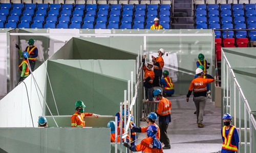 Construction workers wearing face masks assemble partition walls as they convert the Rizal Memorial Coliseum into a quarantine spot to contain the spread of novel coronavirus in Manila, the Philippines on April 3, 2020. (Xinhua/Rouelle Umali)