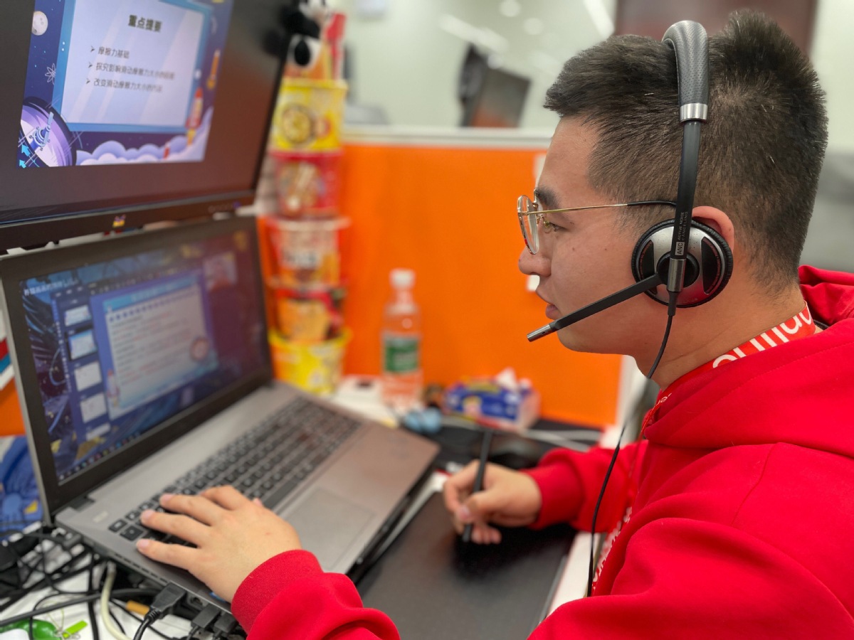 An online education tutor, or a head teacher, from Xueersi Online School guides students online at the company's Zhenjiang base, Jiangsu province in November. [Photo provided to chinadaily.com.cn]