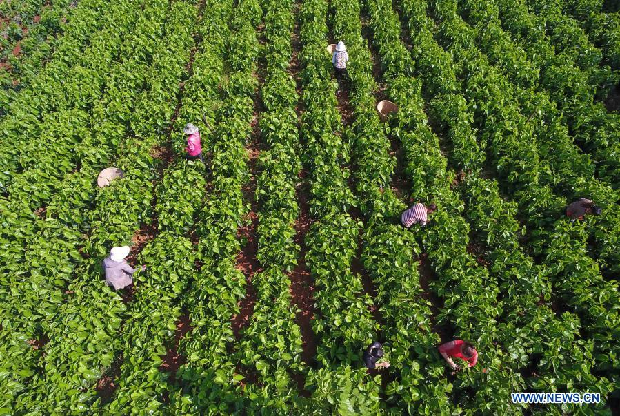 Aerial photo shows farmers picking mulberry leaves at Caohaizi Village of Xundian County, southwest China's Yunnan Province, May 16, 2020. China has removed all its 832 impoverished counties nationwide from the poverty list. Developing industries have played an important role in the country's poverty alleviation efforts, which will be still fundamental to continuously consolidate the poverty-relief achievements. Statistics from China's Ministry of Agriculture and Rural Affairs show that all 832 impoverished counties have carried out more than one million industrial projects and built over 300,000 industrial bases in total, with each county having 2-3 leading industries and up to 98% of impoverished people benefited. From poverty-relief workshop to industrial cooperatives, those once-impoverished counties have strived to continuously develop industries based on local conditions, as fundamental measures to consolidate poverty-relief achievements and revitalize rural areas. (Xinhua/Yang Zongyou)