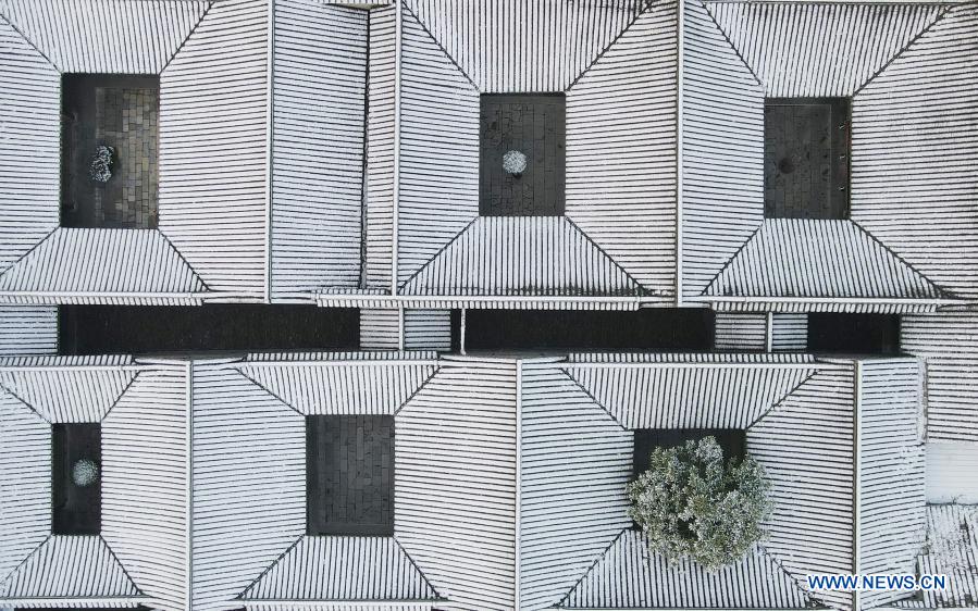 Aerial photo taken on Dec. 14, 2020 shows the snow scenery of the Geyuan Garden in Yangzhou, east China's Jiangsu Province. Snow has fallen in many parts of the country in recent days. (Photo by Meng Delong/Xinhua)
