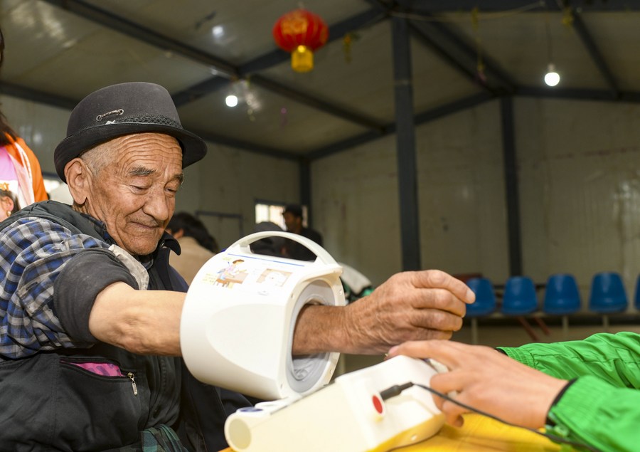 A villager has his blood pressure measured at the clinic of Yaragzi Village in Xihxu Township in Yecheng County, northwest China's Xinjiang Uygur Autonomous Region, May 2, 2020. (Xinhua/Hu Huhu)