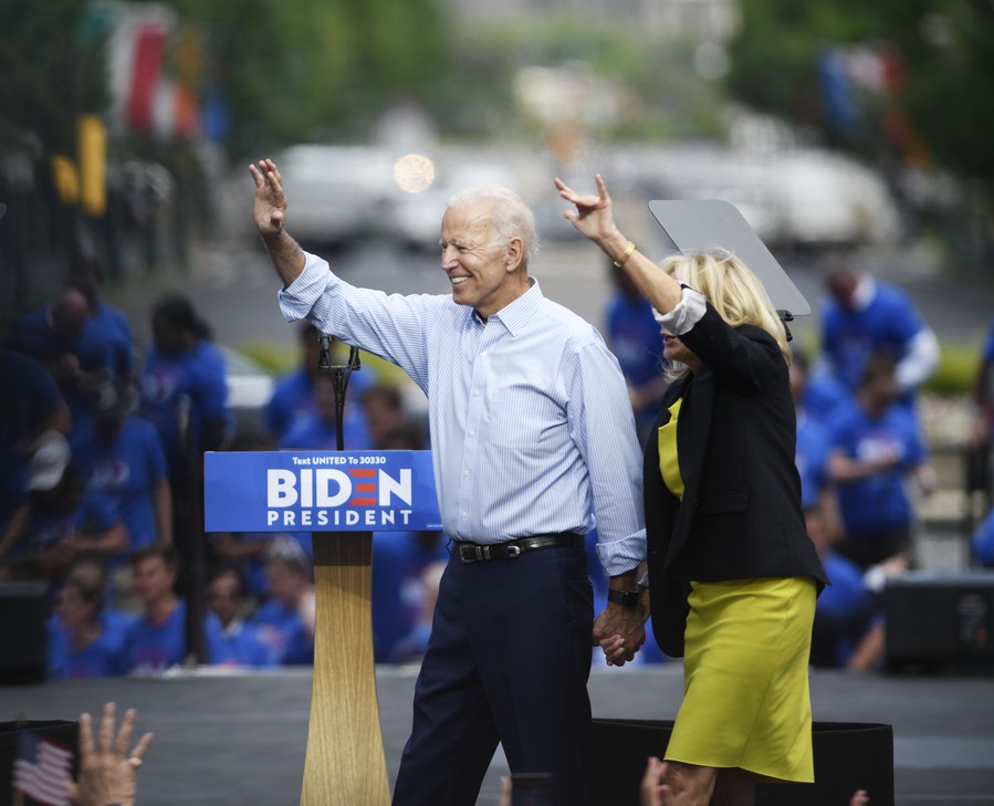 File photo taken on May 18, 2019 shows former U.S. Vice President Joe Biden (L) attending a campaign rally in Philadelphia, the United States. (Xinhua/Liu Jie)