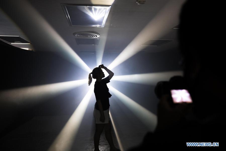 A tourist poses for photos during the "Awakening Bangkok" lighting installation fest in Bangkok, Thailand, Dec. 15, 2020. (Xinhua/Zhang Keren)