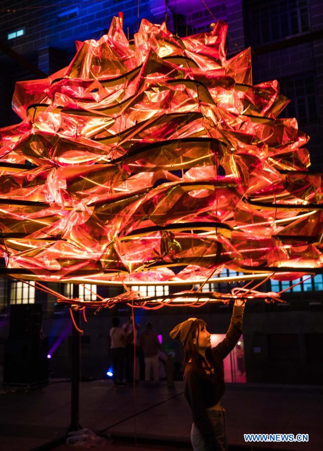 Tourists visit the "Awakening Bangkok" lighting installation fest in Bangkok, Thailand, Dec. 15, 2020. (Xinhua/Zhang Keren)