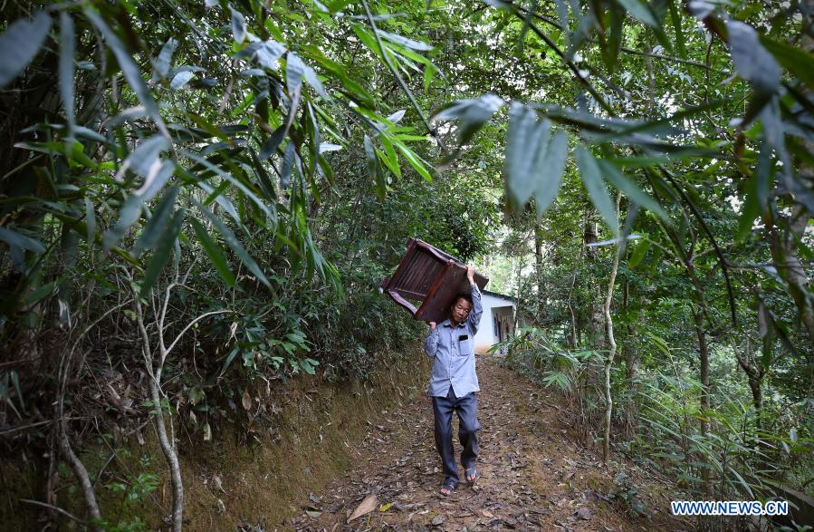 Fu Wangqing, a resident of Gaofeng Village in Baisha Li Autonomous County in south China's Hainan Province, moves a piece of furniture to his new residence at foot of the hill, Dec. 15, 2020. Gaofeng Village sits in central part of the Yinggeling National Nature Reserve, almost isolated from the outer world due to poor condition of mountainous trails. More than 100 families in the village had been living in deep poverty before 2015 as many of them had no access to electricity, mobile telecommunication, and Internet services. They nearly had no alternative source of income apart from rubber plantations. The first round of relocation was initiated in 2015 in Gaofeng Village both to preserve the ecological environment and to improve the residents' income, and 30 families moved to their new residence at foot of the hills in 2017. The second round of relocation followed in 2018 when authorities of Hainan Province decided to start a pilot rainforest national park there. The 100 families remaining in Gaofeng Village were relocated to their new residence merely 3 kilometers away from the prefecture seat of Baisha in December 2020. The local authorities offered 10 mu (or 0.67 hectares) of rubber plantation to each relocated villager, and provided employment and profit-sharing opportunities through edible fungi growing bases. (Xinhua/Guo Cheng)