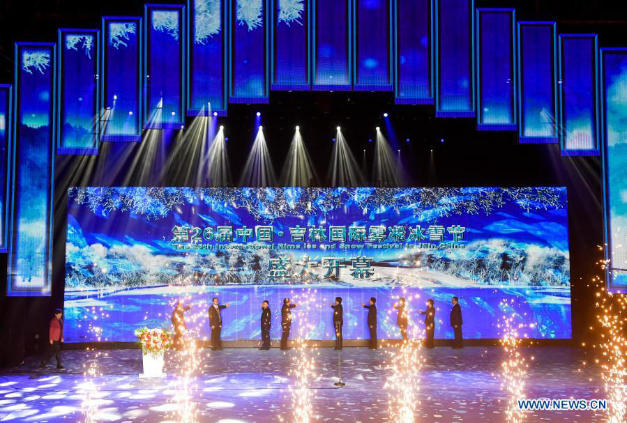 Photo taken on Dec. 18, 2020 shows the opening ceremony of the 26th International Rime Ice and Snow Festival (Jilin, China) in Jilin City, northeast China's Jilin Province. The 26th International Rime Ice and Snow Festival (Jilin, China) kicked off on Friday. The festival will last until February of 2021. (Xinhua/Xu Chang)