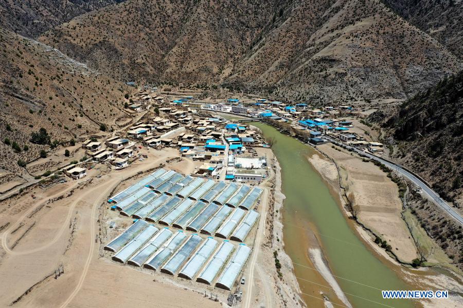 Aerial photo taken on May 7, 2020 shows greenhouses in Zongang County of Qamdo City, southwest China's Tibet Autonomous Region. Through the cultivation of modern agriculture, vegetables are no more rarities on the "roof of the world," making today's Tibetan tables more delicious, nutritious. (Xinhua/Zhan Yan)